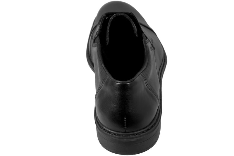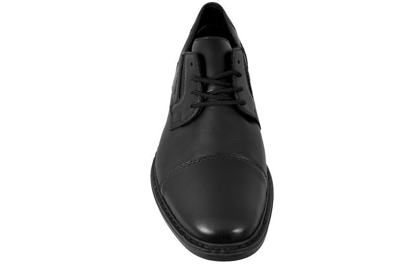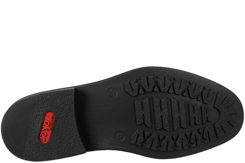 Pæn sort snøresko fra Rieker til herre. Skoen er lavet i sort glat skind. Der er elastik i den ene side ved pløsen og matchende snørebånd, så den let kan tilpasses til foden. Indvendigt er den foret i sort skind samt tekstil. Dæksålerne er lavet af sort skind med den velkendte sål "antistress" med ekstra vidde. Rundt ved sålen er der en sort stikning, som giver en fin detalje. Slidsålen er lavet i sort PVC. Flot sko der kan bruges til festlige lejligheder og hverdag.