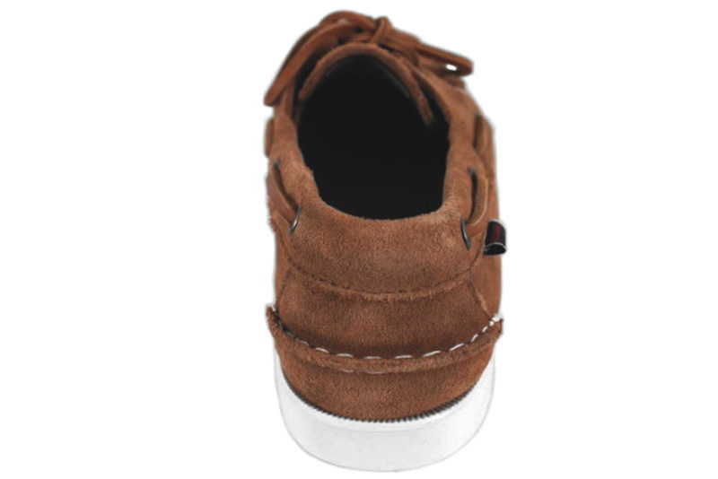 Brun sejlersko i ruskind. Sejlerskoen har brune skindsnørebånd. Skoen har hvide stiksyninger til pynt, samt det samme materiale som snørebåndene, i hver side. På ydersiden er der et mærke, hvorpå der står "SEBAGO". Slidsålerne er hvide. Dæksålerne er med stødabsorbering, svangstøtte og en god komfort.