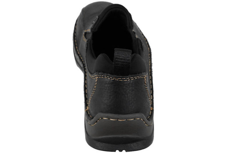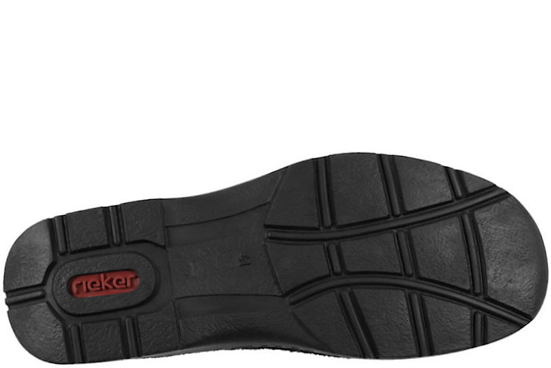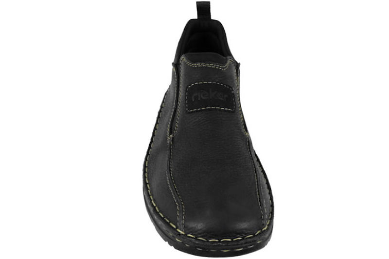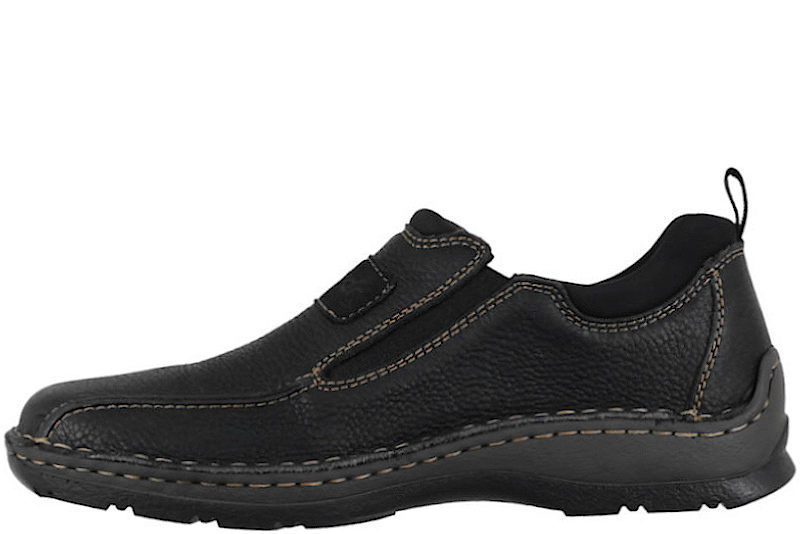 Super god hyttesko fra Rieker til herre. Skoen er lavet af sort olieret skind. I begge sider af skoen er der sort elastik, så den er let at komme i og få af. Rundt på skoen er der brune syninger, som giver en smart detalje. Indvendigt er den foret med sort tekstil. Slidsålen er en sort PVC sål med stødabsorbering. Denne model er med ekstra vidde.