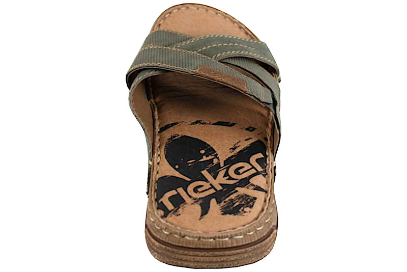 Let slippers med tre remme over vristen, fra Rieker til mænd. Overdelen er lavet i støvet grønt skind og ruskind. Der er elastik på den ene rem. Dæksålerne er lavet i brunt skind. Sandalen har et Rieker logo og tekst i bunden af dæksålerne. Rundt ved sålen er der lyse stikninger. Slidsålen er lavet i brunt PVC. Super flot slippers til herre.