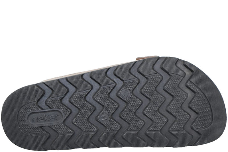 Lækker slenters fra Rieker til herre. Den er lavet i brunt ruskind. Der er to remme, én over vristen og én over forfoden. Remmene er med spænder. Indvendigt er skoen foret med brunt tekstil. Dæksålen er i brunt ruskind, dæksålen er den velkendte Antistress sål fra Rieker. Sålen er med ekstra vidde. Slidsålen er en grov sort sål.