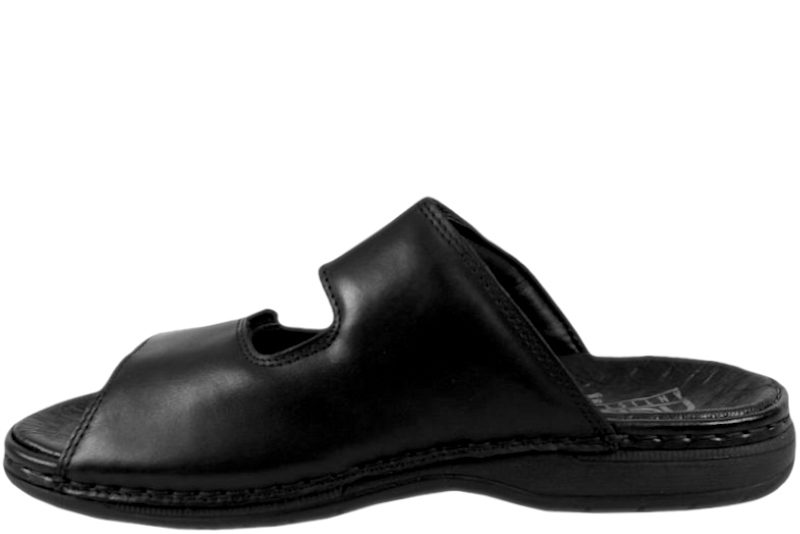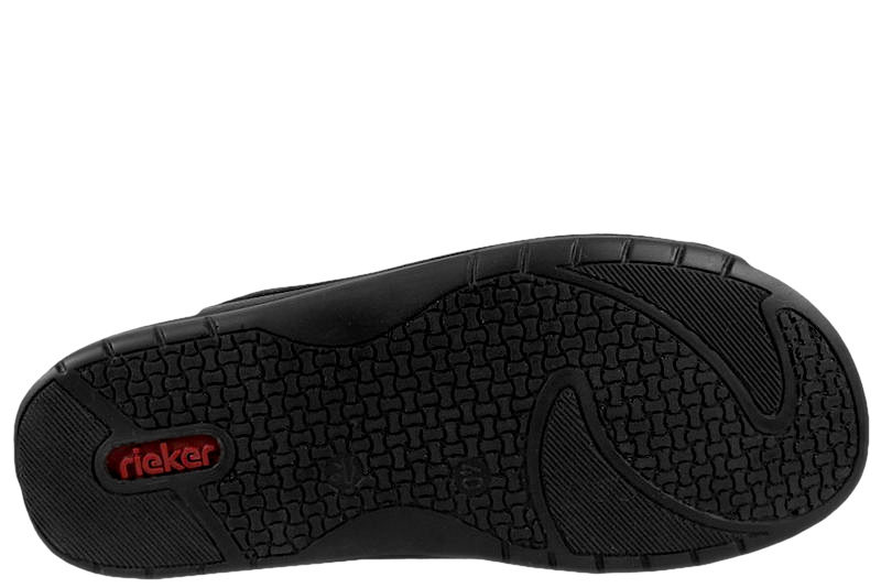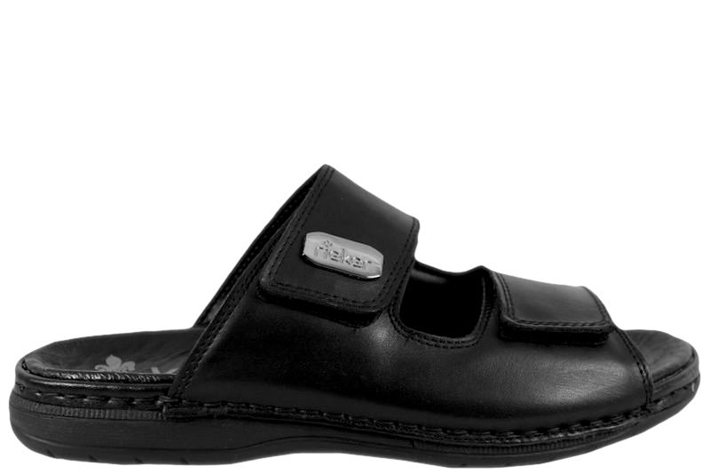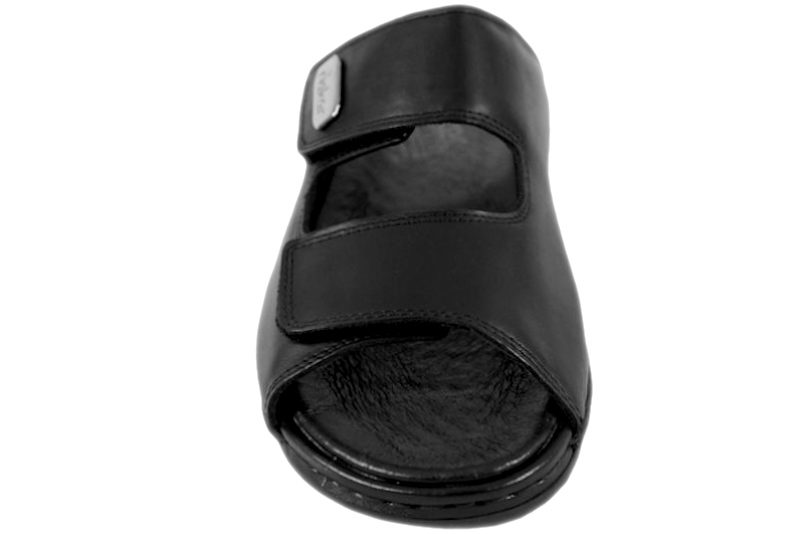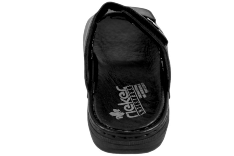 Super god slenters fra Rieker. Skoen er lavet i sort glat skind. Der med to velcroremme over forfoden, så den let kan justeres efter foden. Indvendig er den foret med sort tekstil og skind. Slidsålen er en sort slidstærk gummisål. God slenters, der kan bruges både om sommer, men også som hjemmesko.