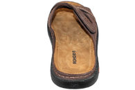 Smart slenters fra Rohde til herre. Skoen er lavet i mørkebrunt olieret skind. Den har tre remme, der krydser hiandnen over forfoden. Den øverste af remmene har velcrolukning. Indvendigt er den foret med mørkebrunt ruskind. Dæksålen er en brun ruskindssål med mønster, så den er dejlig og behagelig at gå på. På mellemsålen er der Rohdes logo i orange. Slidsålen er lavet i sort gummi.