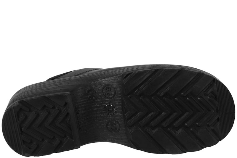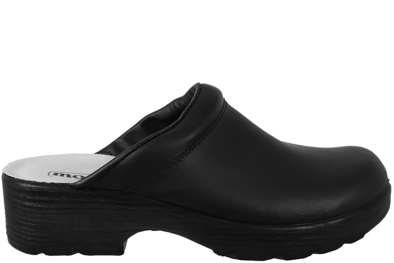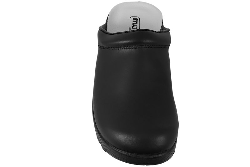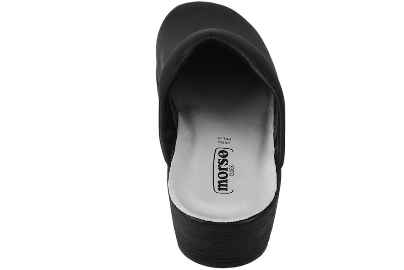 Træsko fra Morsø uden hælkappe i sort glat skind. De har en normal læst, og en super god pasform. Træskoen er med gummisåler, som gør dem bøjelige. En god træsko, både til arbejde og have.