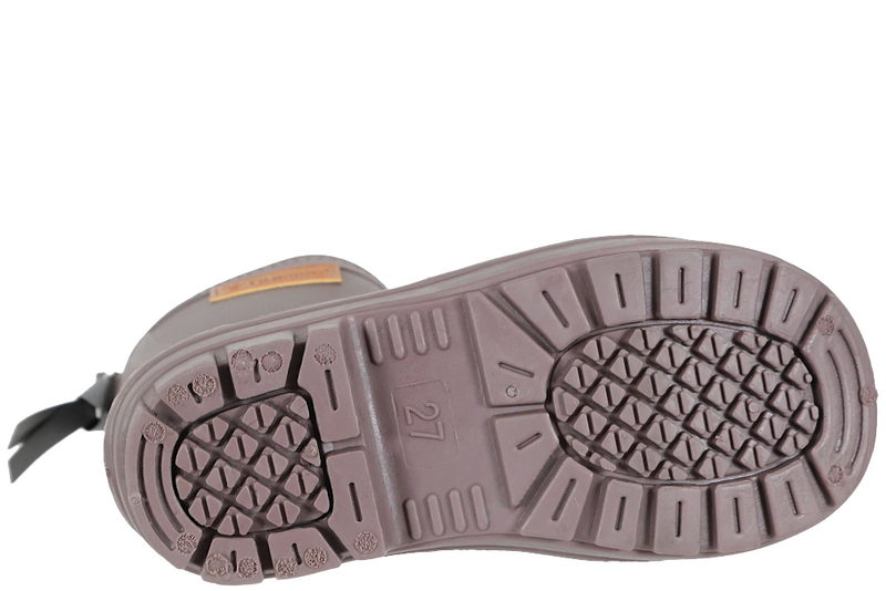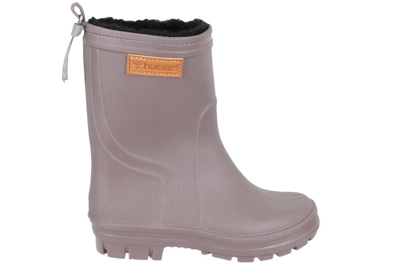Super smart termo gummistøvle til børn. Støvlen er lavet af lilla gummi, og har Hummel logoet i brunt materiale på siden. Indvendigt er støvlen foret med sort plys i tekstil, som holder foden dejligt varm. Slidsålen er også lavet af lilla gummi, i et struktureret mønster så man står godt fast. Rigtig klassisk termostøvle, der holder foden varm.