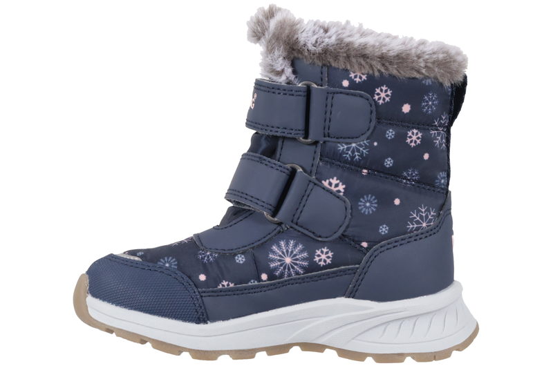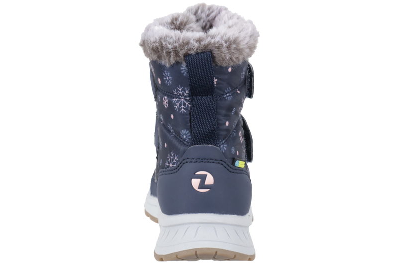 Varm vinterstøvle fra Zigzag til pige. Støvlen er lavet af blå tekstil med lyserøde snefnug detaljer. Foran er der to justerbar velcro remme. Indvendig er den foret med lysegrå plysfoer, der gør den dejlig varm. Mellemsålen er grå og har en brun/grå slidsål i gummi, så man står godt fast. Modellen er waterproof.