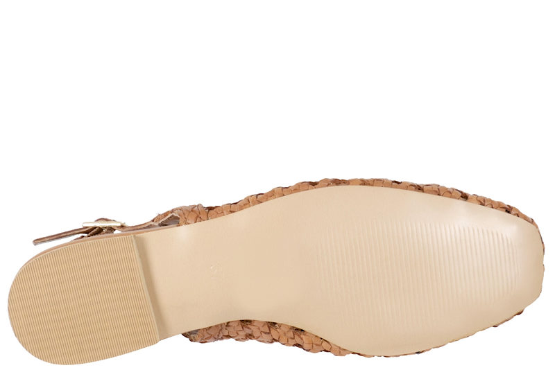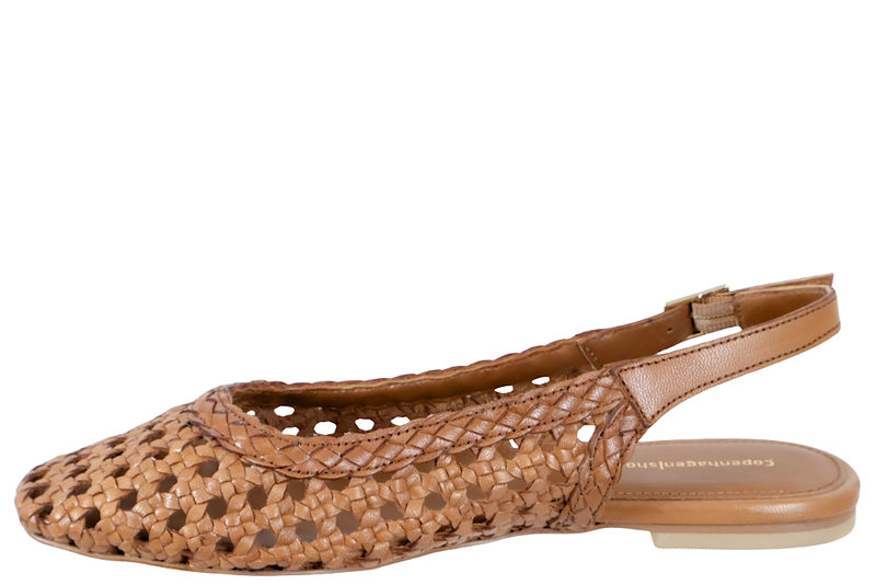 Super fin ballerina med slingback fra Copenhagen Shoes. Den er lavet af brunt skind i flettet look. Slingback kan justres med et spænde. Indvendig er den foret med brunt skind og har en skind dæksål. Slidsålen er en lyst PVC sål.