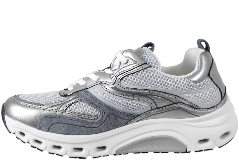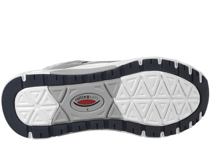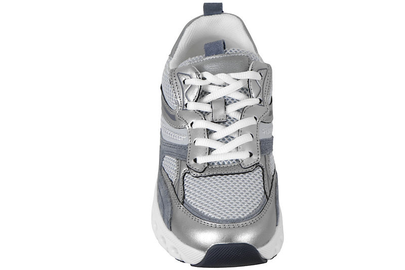 Smart sneakers fra Gabor til dame. Skoen er lavet af en kombination af skind og tekstil i farverne sølv og grå. Foran er der hvide snørebånd, så den let kan justeres efter foden. Indvendig er den foret med hvid tekstil og har en Rolling Soft indlægsål med gænge. Slidsålen er lavet af hvid PVC, samt sort og grå gummi, så man står godt fast. En lækker sko der kan bruges til lidt af hvert.
