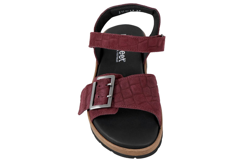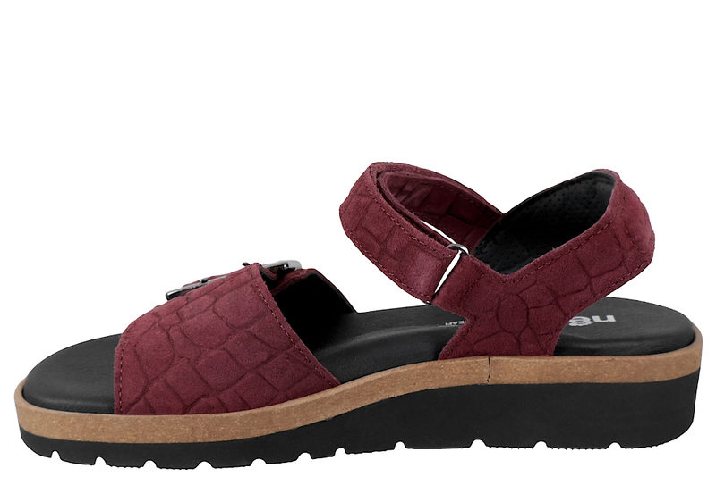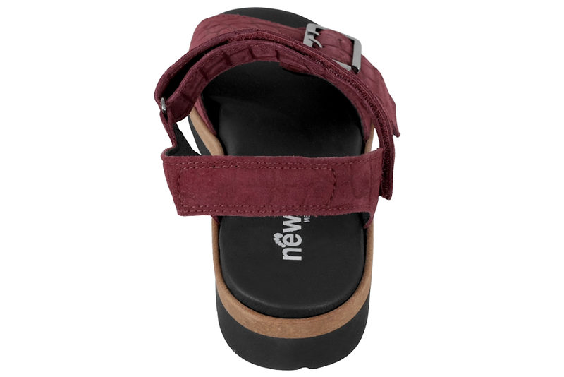 Rigtig god sandal til damer fra New Feet. Sandalen er lavet af ruskind med præget look, i en flot bordeaux rød farve. Sandalen er med to justerbare remme, hvor den over forfoden lukkes med et spænde, og den over vristen med velcro, hvilket gør at de kan tilpasses perfekt til foden. Indlægssålen er sort og 6 mm. tyk. Sålen har en utrolig god støtte, er stødabsorberende og blød. Denne model har ekstra støtte i svangen. Indlægssålen sidder fast med velcro. Slidsålen er sort og er lidt højere bagtil. Dette giver en god holdning. Det højeste sted måler 3,1 cm. Mellemsålen er lysebrun. Sandalen er meget velegnet til gigtramte, diabetikere og generelt følsomme fødder. God sandal med en super god støtte.