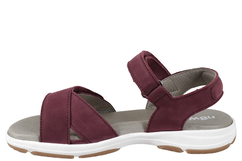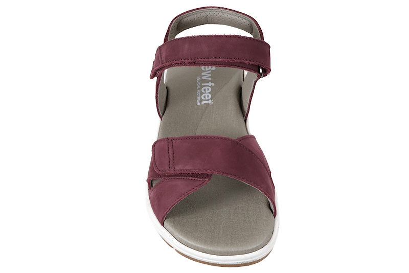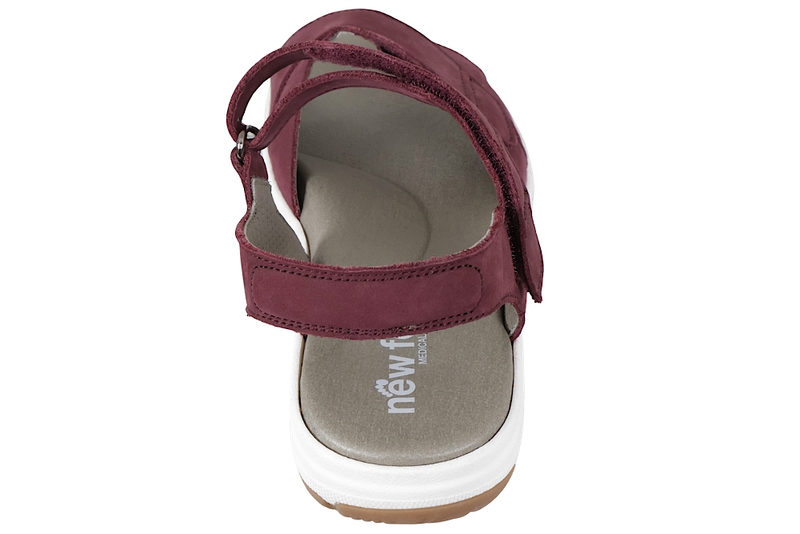 Flot bordeaux rød sandal i olieret nubuck fra New Feet til damer. Sandalen er med to justerbare remme, der lukkes med velcro, hvilket gør at de nemt kan tilpasses perfekt til foden. Indlægssålen er grå og er 6 mm. tyk. Sålen har en utrolig god støtte, er stødabsorberende og blød. Denne model har ekstra støtte i svangen. Indlægssålen sidder fast med velcro. Slidsålen er en hvid og naturbrun gummisål, så man står godt fast. Sandalen er meget velegnet til gigtramte, diabetikere og generelt følsomme fødder. God sandal med en super god støtte.