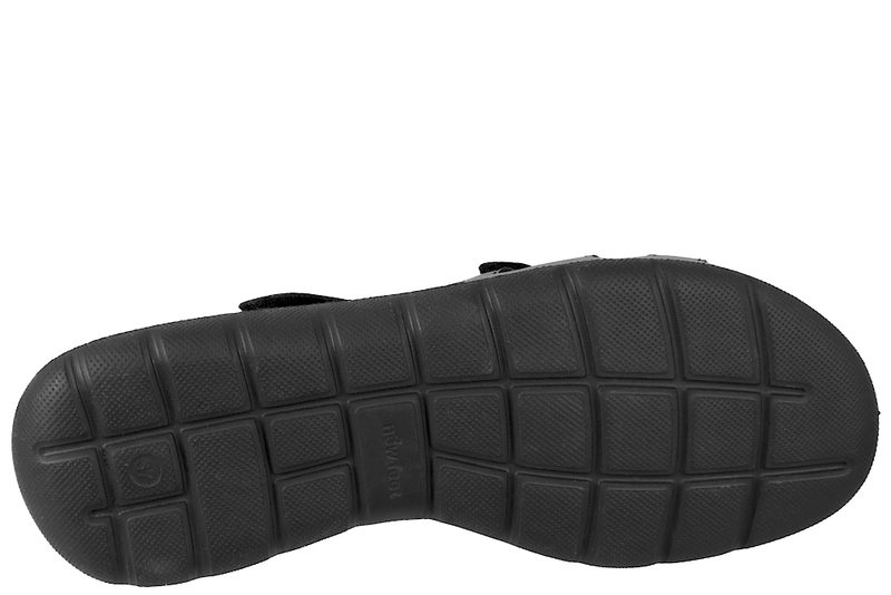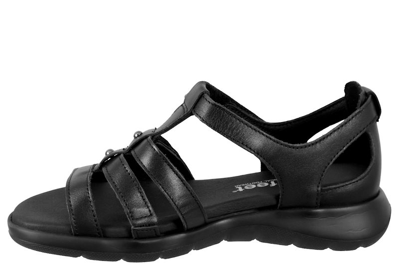 Rigtig god sandal til damer fra New Feet. Sandalen er lavet af sort glat skind. Foran er tre remme henover tærene, hvor den øverste kan justres, samt en rem ved anklen, der kan tilpasses. Indvendig er den foret med sort Onsteam, som er 100% åndbar. Sandalen er med New Feet"s velkendte 6mm indlægssål, der skåner knæ og ryg. Der er ingen indvendige syninger, så sandalen er velegnet til personer med gigt og diabetes.