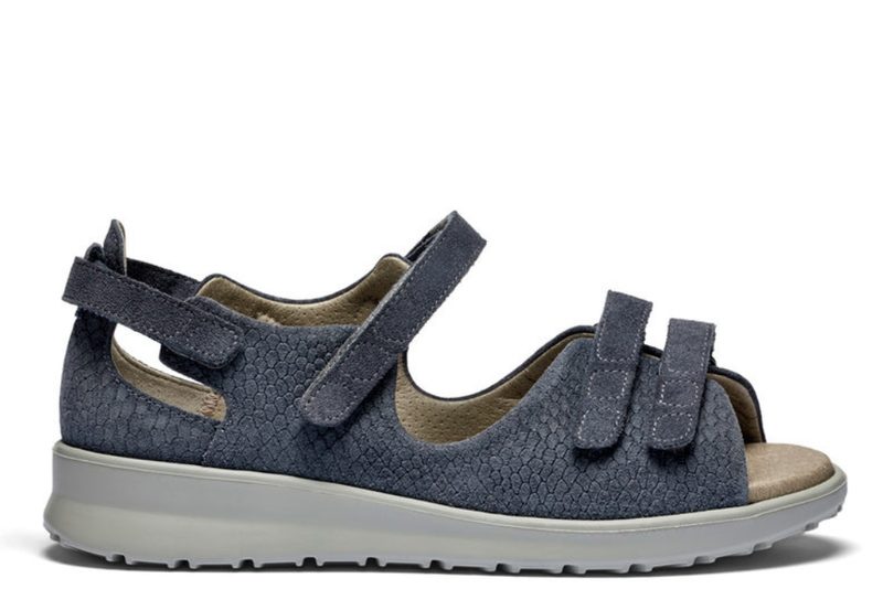 NEW FEET. Super gode New feet sandaler i gråblå præget nubuck med stikninger. Sandalen er med fire justerbare velcroremme, tre over foden og en bagtil. Disse remme kan nemt klippes til, hvis man synes de er for lange. Indlægsålen er 6 mm. og har en utrolig god støtte, er stødabsorberende og bløde. Indlægsålen sidder fast med velcro og er derfor udtagelig. Der er ingen indvendige syninger, og modellen har en stabil hælkappe som er velegnet til gigtramte, diabetiker og følsomme fødder. Slidsålen er en god solid gummisål, som står godt fast. God sandal med en super god støtte.