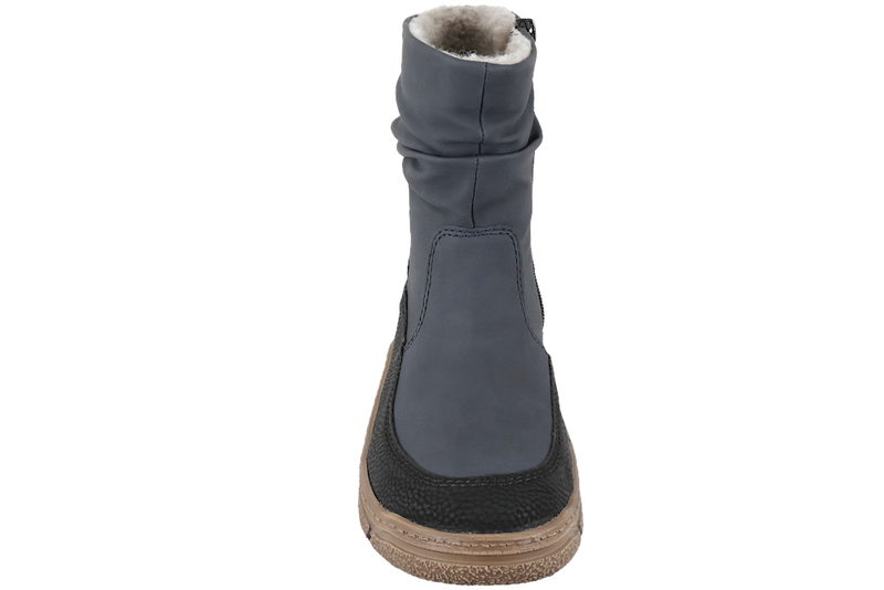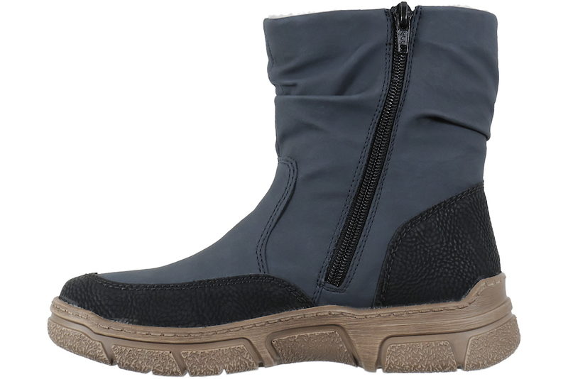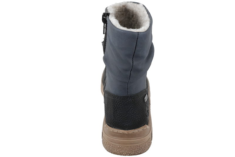 Lækker vinterstøvle fra Rieker til dame. Støvlen er lavet af mørkeblå PU med sorte detaljer. Indvendigt er den foret, og den har en antistress dæksål, der er dejlig behagelig at træde på. Slidsålen er lavet af brunt PVC. Modellen er med RiekerTEX, som gør den vandtæt. Støvlen er med ekstra vidde.
