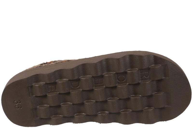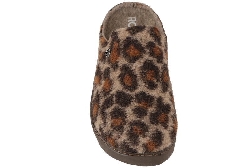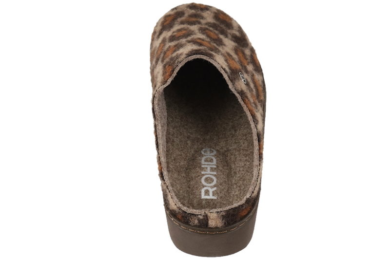 Super fin hjemmesko fra Rohde til damer. Hjemmeskoen er lavet i filt med leopard look. Indvendigt er den foret med naturbrunt filt og har en brun indlægssål ligeledes i filt. Slidsålen er en brun PVC sål, som man går fantastisk på. Skøn og lun hjemmesko fra Rohde.