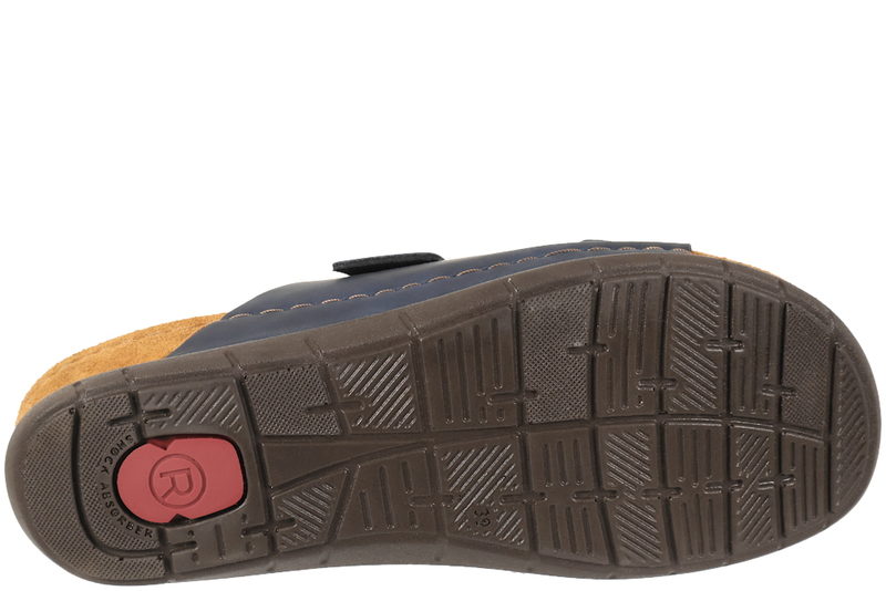 Slippers i mørkeblå tekstil fra Rohde. Indvendigt er der en super blød lædersål, som er super behagelig og stødabsorberende. Sandalen har to remme foran, med to metal lukninger i sølv. Sandalen har en lille hæl på 4,5 cm. så den har en god højde. Slidsålen er lavet i brunt EVA-skum med stødabsorbering i hælen.