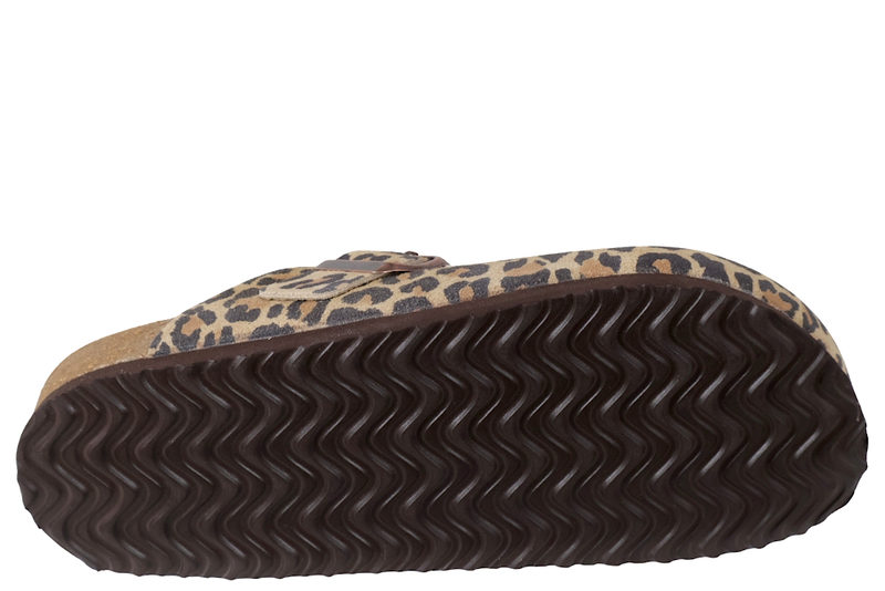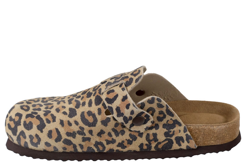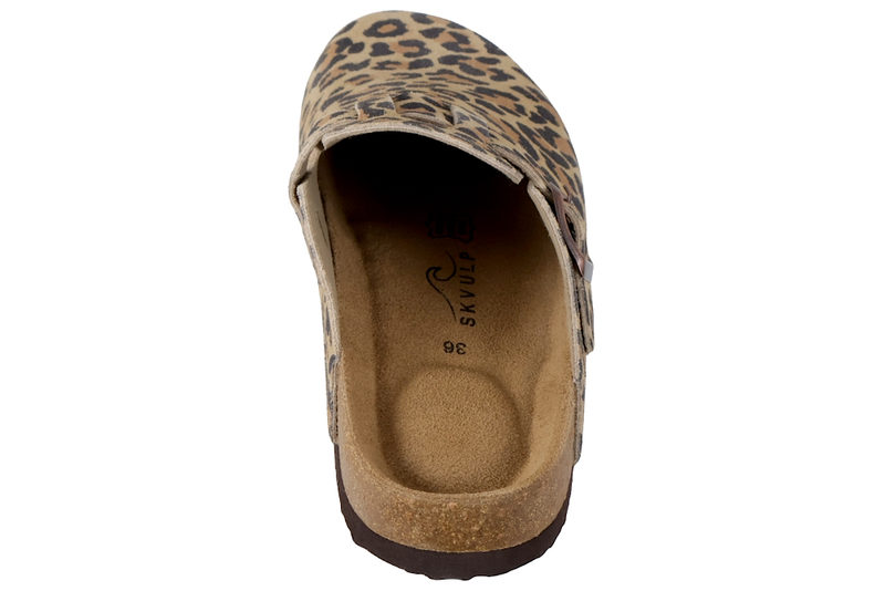 Super smarts slenters med lukkede snude til damer. Den er lavet af skind med leopard look. Henover vristen er der en rem, der kan justres med et spænde. Indvendig er den foret med lyst skind og har en blød skind dæksål. Mellemsålen er af kork. Slidsålen er en brun PVC sål.