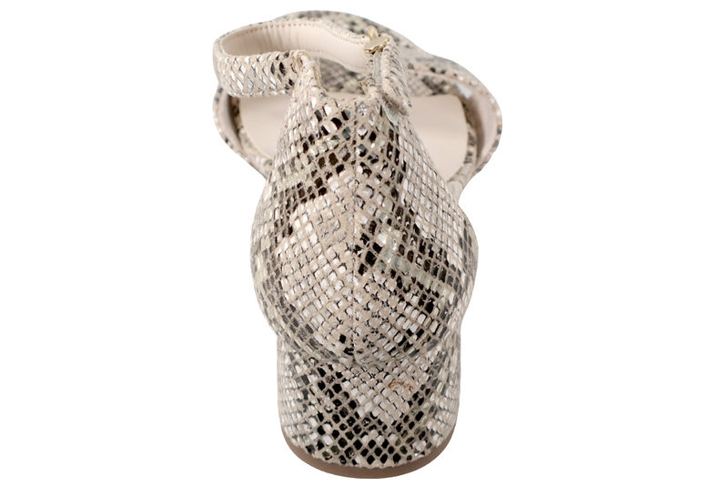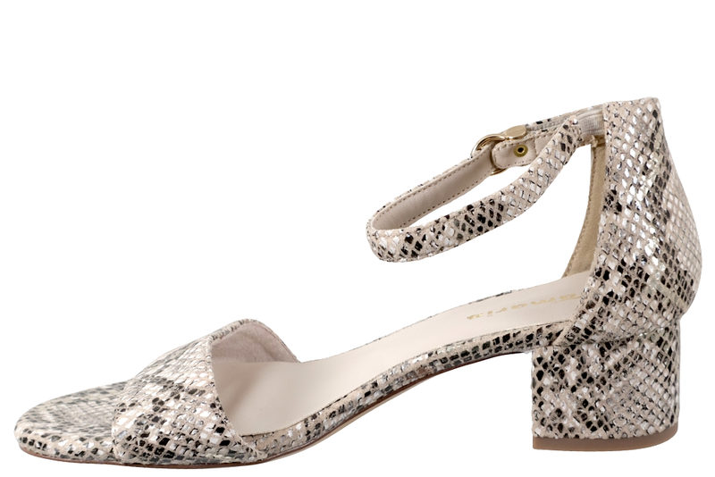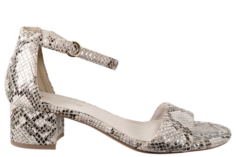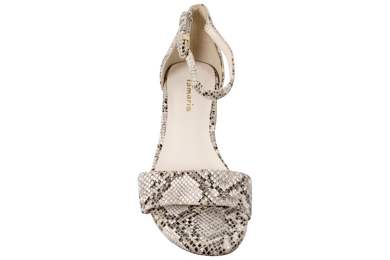 Super flot og feminin sandal fra Tamaris. Sandalen er lavet i tekstil med en flot slangeskinds prægning. Sandalen har en rem over forfoden. Sandalen har også en hælkappe med ankelrem, så hælen sidder stabilt i sandalen. Ankelremmen kan justeres med en velcro, så de sidder godt fast på foden. Hælen er en lille blokhæl på 4 cm. Indvendigt er den foret med tekstil, der er behageligt at have om foden uden strømpe. Slidsålen er en naturfarvet slidstærk plast sål, der giver mulighed for dans. Super smart sandal der kan bruges til meget.