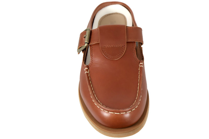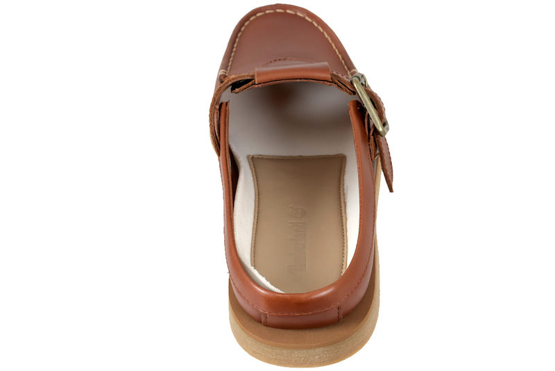 Smart slenters fra Timberland til dame med sejler look. Den er lavet af brunt glat skind og har en rem over vristen med et spænde, der kan tilpasses efter foden. Foran er der moccasin syninger, der giver et smart look. Indvendig er den foret med brunt tekstil og har en hvid indlægsål med en brun skind lap med Timerbland logoet graveret. Slidsålen er lavet af naturbrun gummi, så man står godt fast. En lækker slenters der kan bruges til lidt af hvert.