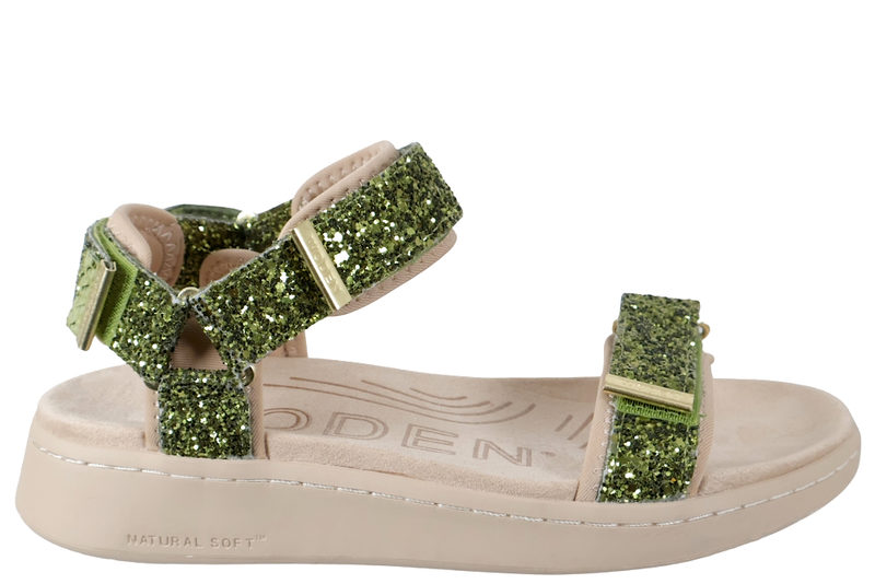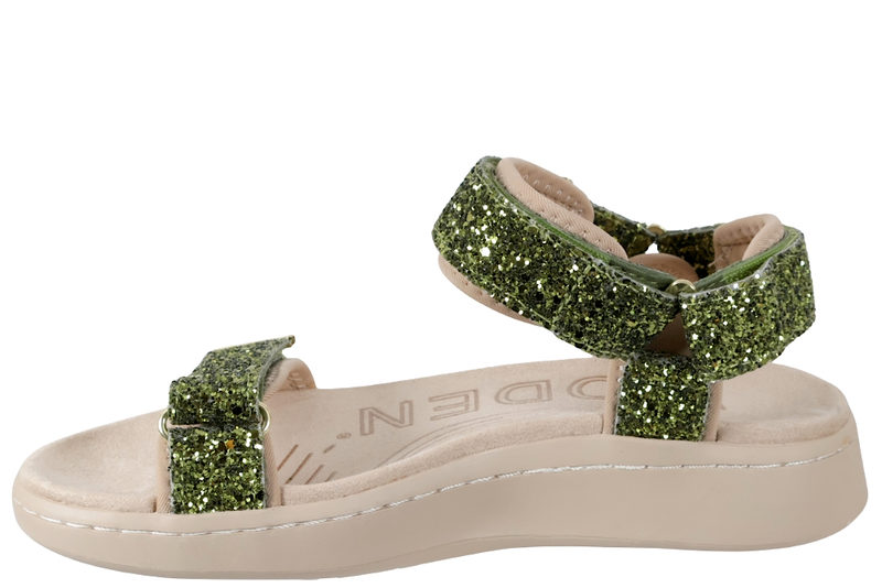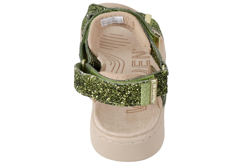 Super smart sandal fra Woden. Sandalen er lavet i grøn tekstil med glimmer. Over forfoden har sandalen en velcrorem, så man let kan justere sandalen efter foden. Ligeså har sandalen en velcrorem ved insteppet samt en hælrem med velcro. Indvendigt er skoen foret med beige tekstil og har en beige dæksål i tekstil. Mellemsålen er en beige chunky gummisål. Slidsålen er lavet af genanvendt gummi. Super smart sandal, som kan pifte ethvert outfit op, og som samtidigt er super behagelig.