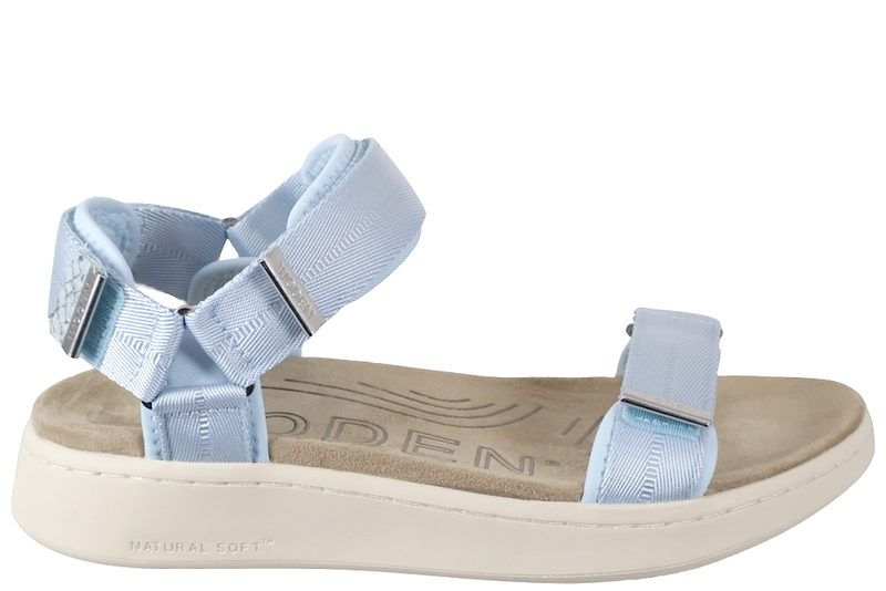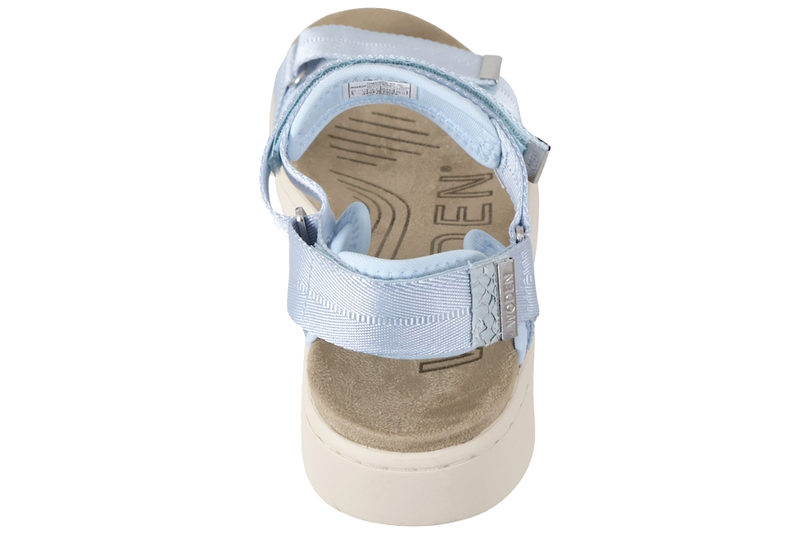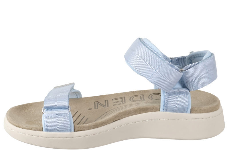 Super smart blå sandal fra Woden. Skoen er lavet i blått tekstil. Over forfoden har skoen en velcrorem, så man let kan justere sandalen efter foden. Ligeså har sandalen en velcrorem ved insteppet samt en hælrem med velcro. Indvendigt er skoen foret med blå tekstil, og den har en grå dæksål i tekstil. Mellemsålen er en beige chunky gummisål. Slidsålen er lavet af genanvendt gummi. Super smart sandal, som kan pifte ethvert outfit op, og som samtidigt er super behagelig.