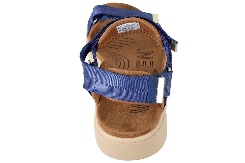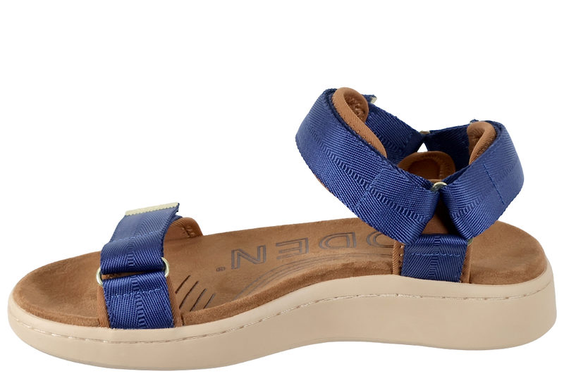 Super smart blå sandal fra Woden. Sandalen er lavet i blåt og brunt tekstil. Over forfoden har den en velcrorem, så man let kan justere sandalen efter foden. Ligeså har sandalen en velcrorem ved insteppet samt en hælrem med velcro. Indvendigt er skoen foret med brunt tekstil, og den har en brun dæksål i tekstil. Mellemsålen er en brun chunky gummisål. Slidsålen er lavet af genanvendt gummi. Super smart sandal, som kan pifte ethvert outfit op, og som samtidigt er super behagelig.