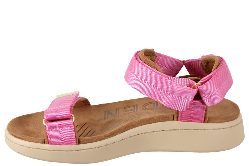 Super smart sandal i farven "aurora pink" fra Woden. Skoen er lavet i pink tekstil. Over forfoden har skoen en velcrorem, så man let kan justere sandalen efter foden. Ligeså har sandalen en velcrorem ved insteppet samt en hælrem med velcro. Indvendigt er skoen foret med pink tekstil og har en brun indlægssål i tekstil. Mellemsålen er en brun chunky gummisål. Slidsålen er lavet af genanvendt gummi. Super smart sandal, som kan pifte et hvert outfit op, og som samtidigt er super behagelig.