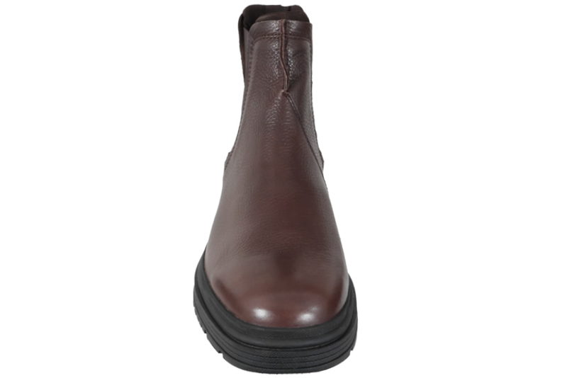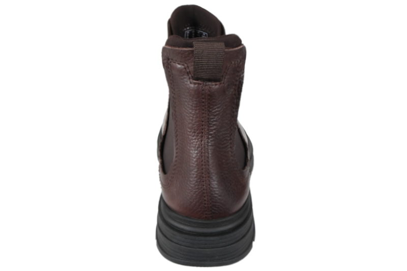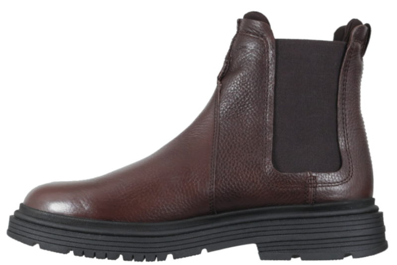Smart støvle fra Clarks til herre. Støvlen er lavet af mørkebrun glat skind. Der er elastik på begge sider, så den er nem og komme i og af. Indvendig er den foret med brun tekstil og har en "Contour Cushion" indlægssål med svangstøtte. Slidsålen er lavet af sort gummi, så man står godt fast.