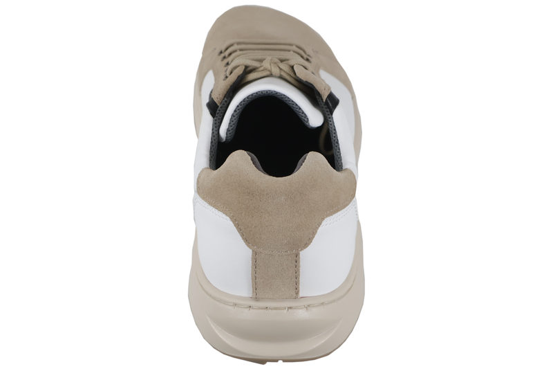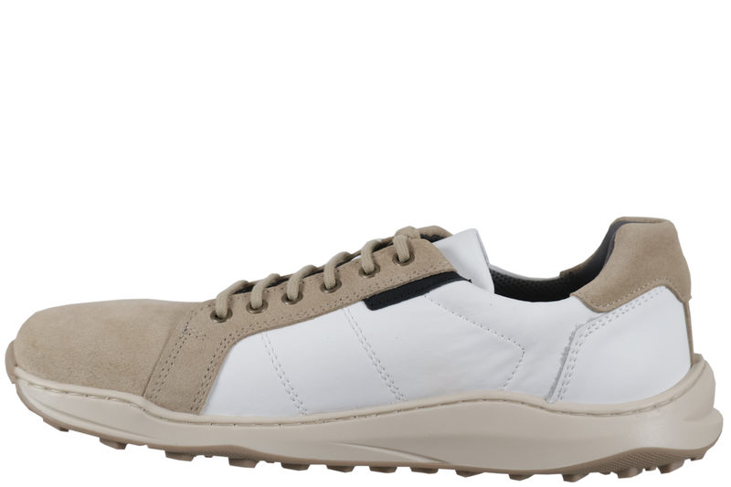 Smart sko fra New Feet til herre. Skoen er lavet af beige ruskind samt hvid glat skind. Foran er der beige snørebånd, så den kan tilpasses efter foden. Indvendig er den foret med tekstil og har en indlægssål i 6mm som skåner knæ og ryg. Der er ingen indvendig syninger, hvilket gør den velegnet til diabetiker og gigt patienter. Mellemsålen samt slidsålen er lavet af beige gummi, så man står godt fast. Modellen er med TEX. Rigtig god model i barefoot stil med masser af plads.