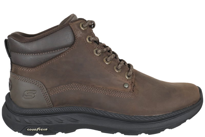 Super smart slip-ins støvle fra Skechers til herre. Støvlen er lavet af brunt olieret skind. Foran er der brune snørebånd, så den kan tilpasses efter foden. Indvendigt er den foret med brunt tekstil, og den har en Air-Cooled Memory Foam dæksål. Mellemsålen er lavet af sort EVA. Slidsålen er en sort Goodyear sål, så man står godt fast.