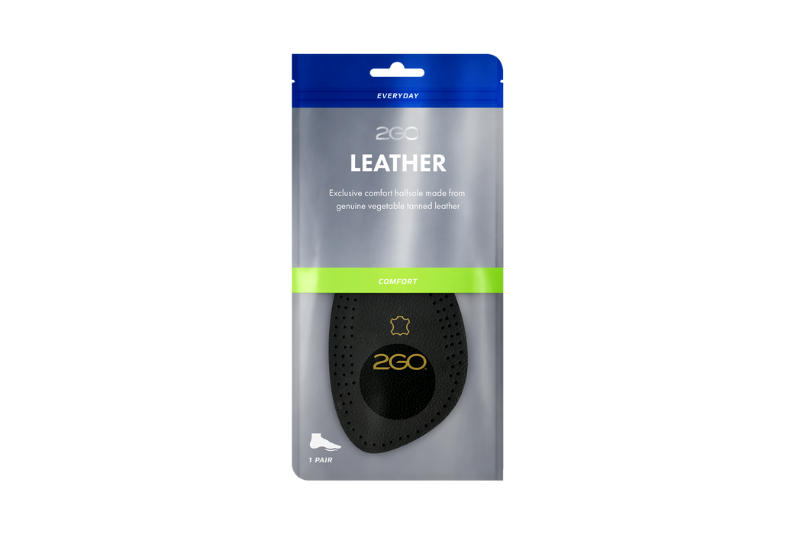 2GO LEATHER 1/2 SÅL. Halvsål med overside af sort læder. Underside i perforeret skumlatex virker støddæmpende. Aktivt kul minimerer dårlig lugt og absorberer fugt.