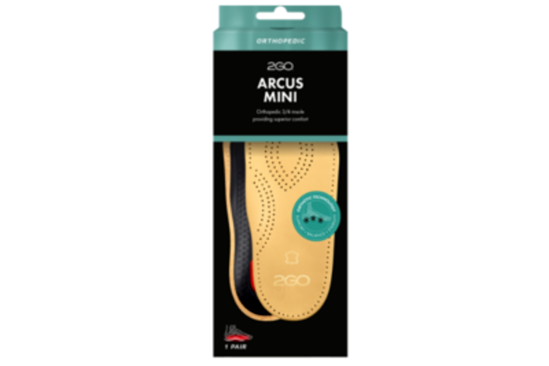 2GO ARCUS MINI. Ortopædisk 3/4-letvægtssål, som giver optimal komfort og aktiverer, stabilisere og beskytter effektivt fodens svang, mellemfod og hæl. OT-teknologien (Orthotic Technology) giver en behagelig støtte forbedre blodcirkulationen og optimere fodens bevægelse. Fodlejet tilpasser sig dynamisk til enhver position uden at optage ekstra plads, hvilket giver en behagelig følelse og mere stabilitet, når du er i bevægelse. Reducere belastning på foden, modvirker smerte og virker afslappende. Forebygger følelsen af brændende fødder.