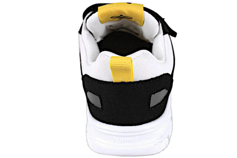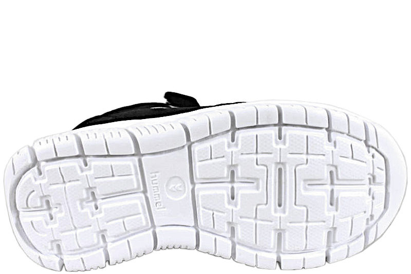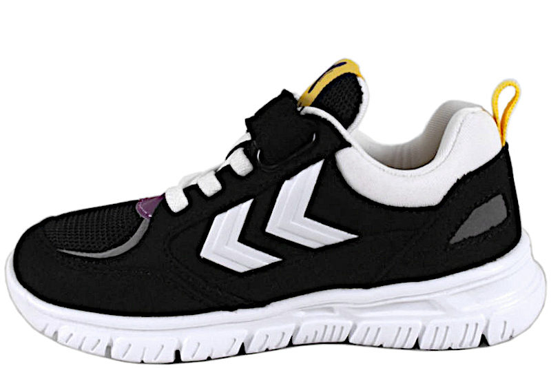 Smart sneakers til piger. Skoen er lavet af sort tekstil. Der er en lilla detalje på forbladet. På begge sider er der hvide Hummel striber. Der er en gul lap på pløsen, hvor der står "X-LIGHT 2.0". Der er hvid elastiksnøre, så den sidder godt fast til foden. Der er en justerbar velcrorem over vristen. Indvendigt er den foret med hvidt tekstil. Indlægssålen er lavet i gult tekstil. Slidsålerne er lavet i hvidt EVA skum, som gør den fleksibe-. God sko, som kan bruges til meget.