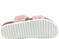 Super smart slenters fra Pepper til piger. Henover forfoden er der to remme, som er lavet af lyserødt tekstil, som ligner strik. Indvendigt er den foret med naturfarvet tesktil og har en blød og behagelig dæksål. Mellemsålen er af kork. Slidsålen er af hvidt PU. Rigtig smart slenters til piger, som kan bruges til de varme sommerdage.