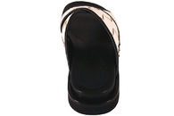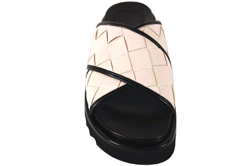 Beige Slenters fra Billi Bi med flettet skind. Der er 2 brede remme, som krydser over vristen. Den har sorte kanter. Slidsålen er en let PU sål, men med et grovt look. Indvendigt træder man på en sort dæksål i skind. Super smart slenters fra Billi Bi.