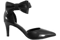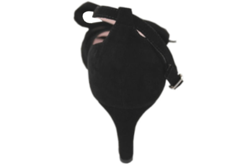Sort stilet med lukket hælkappe. Stiletten er i nubuck og den er skindforet med lyserødt skindfor. Hælen måler 7,5 cm. Den har en krydsrem over vristen, som lukkes med et spænde på ydersiden. Spændet er sølvfarvet. Designet af Josefine Valentin.
