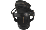 Smart og let sandal til damer fra Copenhagen Shoes. Sandalen er lavet i sort glat skind. Den har små guldfarvede nitter på remmene, som giver en fin detalje. Der er en justerbare velcroremme over vristen. Der er en rem bag hælen, over forfoden og på ydersiden af sandalen. Dæksålerne er lavet i sort glat skind. Slidsålen er lavet i sort EVA skum.