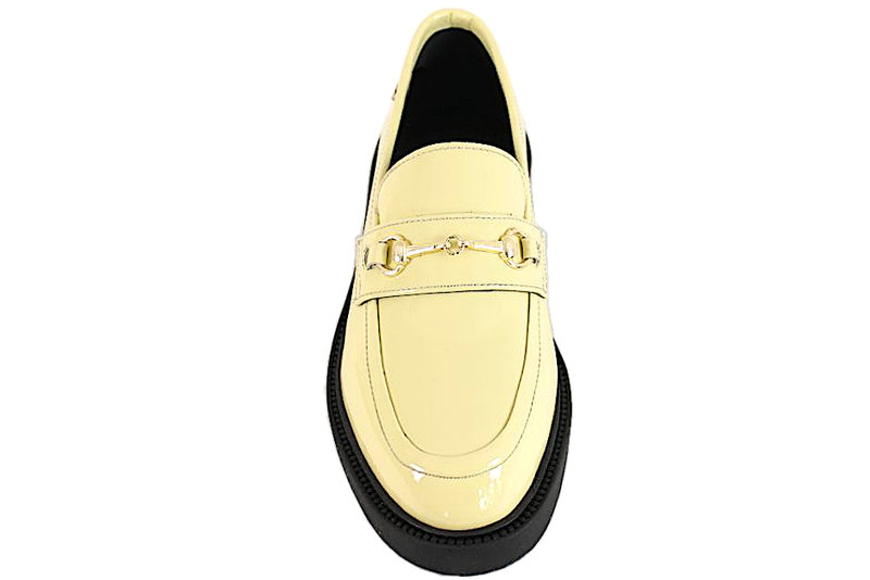 Super god og smart loafers til damer. Den er lavet af skind med lak look i farven banana, som giver et smart look. Foran er der et guld bidsel. Indvendigt er den foret med sort glat skind, og har en skind dæksål. Slidsålen er en sort gummisål. Smart loafers, der kan bruges til hverdag og fest.
