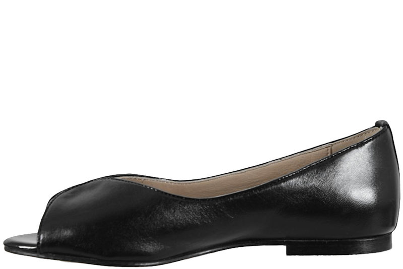 Fin og elegant ballerina med åben tå fra Copenhagen Shoes. Skoen er lavet i sort glat skind, som giver skoen et rent og elegant look. Indvendigt er den foret med nude glat skind og har en dæksål ligeledes i skind. Slidsålen er lavet i brunt tunit, men er sort rundt i kanten. Rigtigt fin og elegant ballerina til enhver anledning.