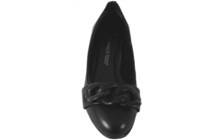 Super smart ballerina fra Marco Tozzi. Den er lavet af sort PU. Foran er der et pynte bidsel i form af sorte lænker, som giver et smart look. Indvendigt er den foret med sort tekstil og har en Feel Me dæksål. Slidsålen er en sort PVC sål. Rigtig god ballerina, der kan bruges til mange anledninger.