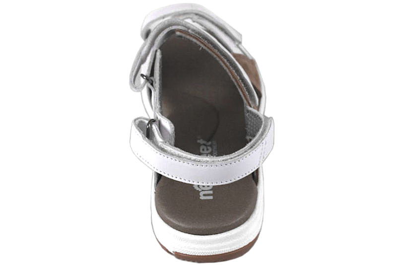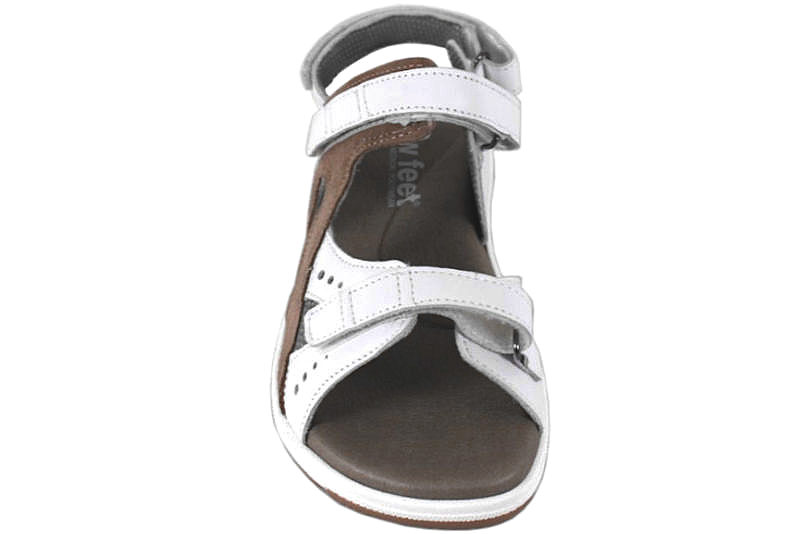 God sandal fra New Feet. Den er lavet af en kombination af hvidt glat skind og brunt nubuck. Henover forfoden er der to justerbarer velcroremme samt et velcrobånd om hælen. Indvendigt er den foret med lyst PU og har en 6 mm. indlægssål, som er stødabsorberende. Slidsålen en brun og hvid gummisål. Denne model er velegnet til personer med gigt og sukkersyge. Der er ingen indvendige syninger.