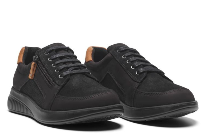 Smart sort sko fra New Feet til damer. Overdelen er lavet af sort ruskind og nubuc. Skoen har en lille detalje med et stykke brunt nubuck på hælkappen. Der er matchende snørebånd, så den let kan tilpasses til foden. Den har en lynlås på ydersiden, så den er let at komme i og af. Skoen har en lækker blød gummisål og en 6 mm. støddæmpende indlægsål. Skoen har fast hælkappe, der holder foden i den rigtige position. Der er god plads, hvilket gør den meget anvendelig med sin egen specialfremstillede indlægssål. Skoene er specielt egnede til vanskelige fødder såsom gigt og diabetes fødder.