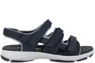 Sandal i blå mikrofiber med præget tekstur fra New Feet. Sandalen er med 2 remme, en over forfoden og en ved insteppet. Sandalen kan reguleres, så den passer perfekt til foden. Sandalen har en god pasform. Sandalen er stødabsorberende og perfekt til gigtramte, diabetiker og følsomme fødder. Mellem- og slidsålen er en blanding af farverne grå og sort.
