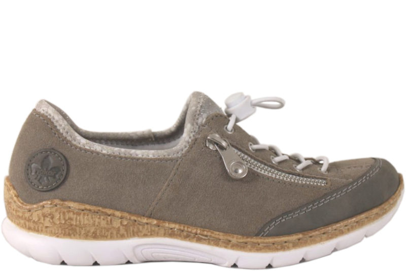 God travesko fra Rieker. Skoen er lavet i gråt ruskind og lys tekstil. Foran er der hvide elastik let luk snørebånd, så den er let at komme i og af. På ydresiden er der en pyntelynlås. Indvendigt er den foret med hvidt tekstil og har en MomoSoft dæksål, der er blød at træde på. Slidsålen er en hvid gummisål med stødabsorbering. God sko der kan bruges til mange anledninger.