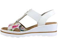 Super smart sandal fra Rieker. Sandalen er lavet i hvidt præget PU. Ved forfoden har sandalen en super flot rem med krokoprægning i flotte sommerlige farver. Sandalen har langs vristen en t-rem med flotte cirkler, som giver sandalen et flot touch. Ved insteppet har sandalen hvid elastik, som gør sandalen let at komme i samt den sidder flot ind til foden. Sandalen er med bagrem. Indvendigt er den foret med beige PU, og har en brun tekstil dæksål. Mellemsålen samt slidsålen er lavet af hvidt PU. Sandalen er med plateausål, som måler 4,5 cm. Super smart sandal som passer til meget.