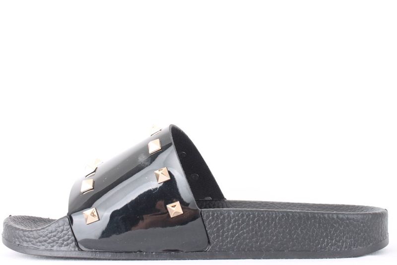 SOFIE SCHNOOR. Smart slenters fra Sofie Schnoor. Sandalen har én bred rem over forfoden. Remmen er i sort lak look med guld nitter. Smart som kan bruges som slenters eller badesandal. Smart slippers, der er lige til at smutte i.