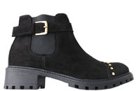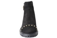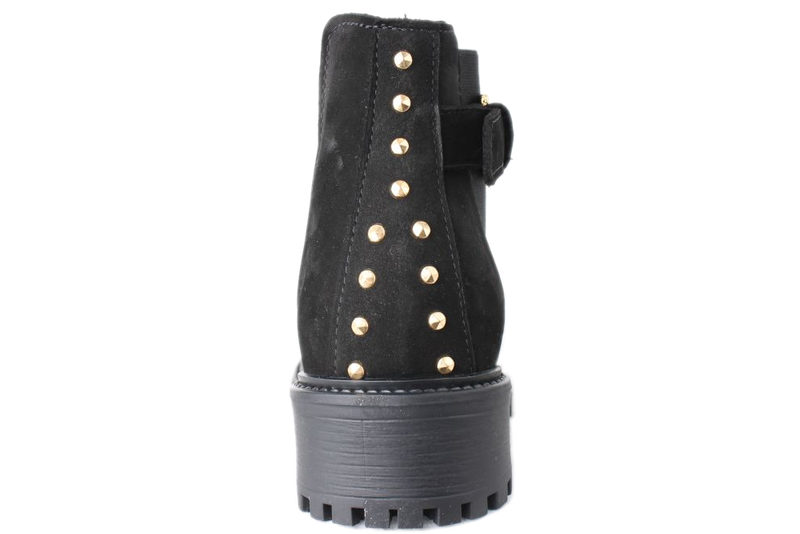 Sort Chelsea støvle i nubuck fra Sofie Shcnoor. Støvlerne har elastik i begge sider og på ydersiden er der en pynterem med et guldspænde. Bagpå støvlen og henover snuden er der guldnitter. Slidsålerne er sorte og bløde gummisåler. Indvendig træder man på en skind dæksål. Super smart og mode rigtig støvle.