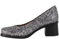 Super smart pumps fra Tim & Simonsen. Skoen er lavet i skind med sort/sølv glitter, som giver den et flot og festligt look. Skoen er med en firkantet snude, som giver den et lille pift. Indvendigt er skoen foret med naturfarvet glat skind og har en dæksål ligeledes i skind. Slidsålen er lavet af sort gummi. Skoen er med en blokhæl, så den er let at gå i. Sålen måler 4,5 cm.