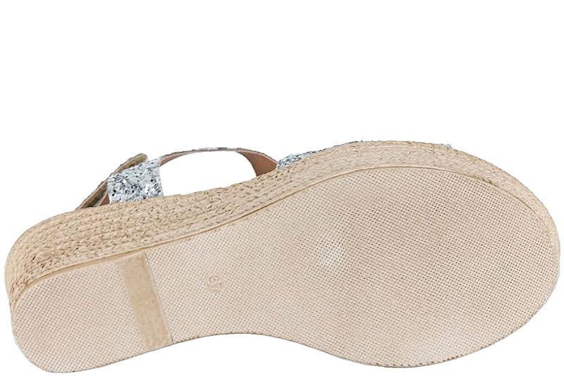 Super smart sandal på kilehæl fra Tim og Simonsen. Skoen er lavet i tekstil med sølvglitter. Skoen har en rem over forfoden, som forbindes med en rem på tværs af vristen. Den har også en rem ved anklen, som giver et super flot snit til skoen. Sandalen har en regulerebar rem rundt om hælen med velcro, som gør at sandalen er let at komme i og af. Indvendigt er skoen foret med brunt skind og har en brun skind dæksål. Mellemsålen er lavet af PU med flettet siv look, der giver sandalen en smart detalje. Slidsålen er lavet af lyst PU. Sandalen har en plateausål, som måler 4,5 cm. og en kilehæl som måler 8 cm. Super smuk og let sandal, der kan pifte ethvert outfit op.