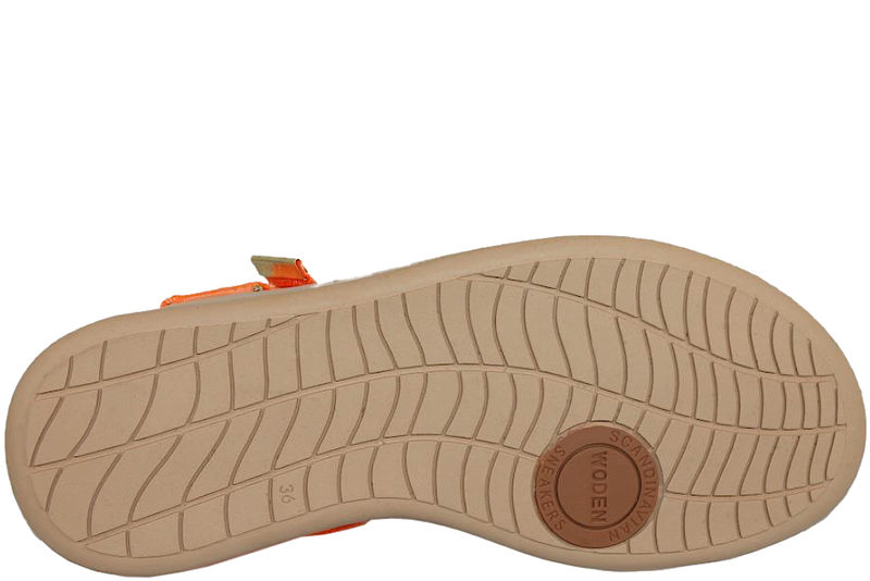 Super smart sandal fra Woden i farven neon orange. Skoen er lavet i orange og brunt tekstil. Over forfoden har skoen en velcrorem, så man let kan justere sandalen efter foden. Ligeså har sandalen en velcrorem ved insteppet samt en hælrem med velcro. Indvendigt er skoen foret med brunt tekstil og har en brun tekstil indlægssål. Mellemsålen er en brun chunky gummisål. Slidåslen er lavet af genanvendt gummi. Super smart sandal, som kan pifte et hvert outfit op, og som samtidig er super behagelig.