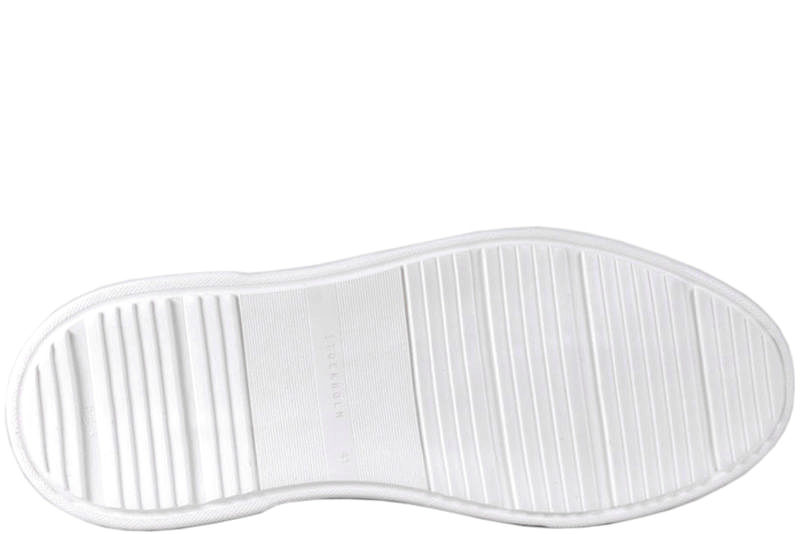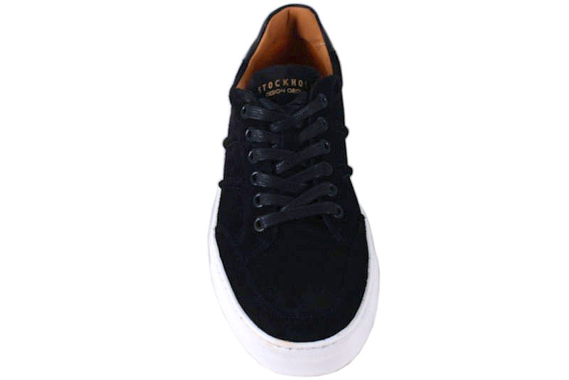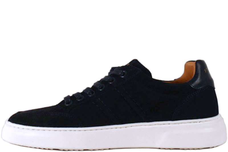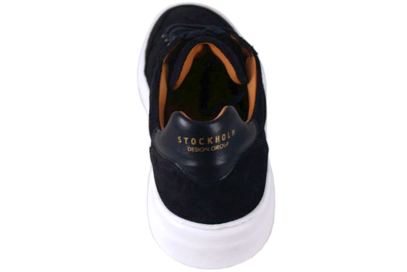 Mørkeblå sneakers i ruskind fra Stockholm Design Group. Den har en glat skinddetalje på hælkappen. Deres logo står på både pløsen og hælkappen med en flot guldskrift. Indvendigt er den foret med skindfoer. Slidsålen er en hvid gummisål. Super smart herresko, som kan bruges til hverdag og fest.